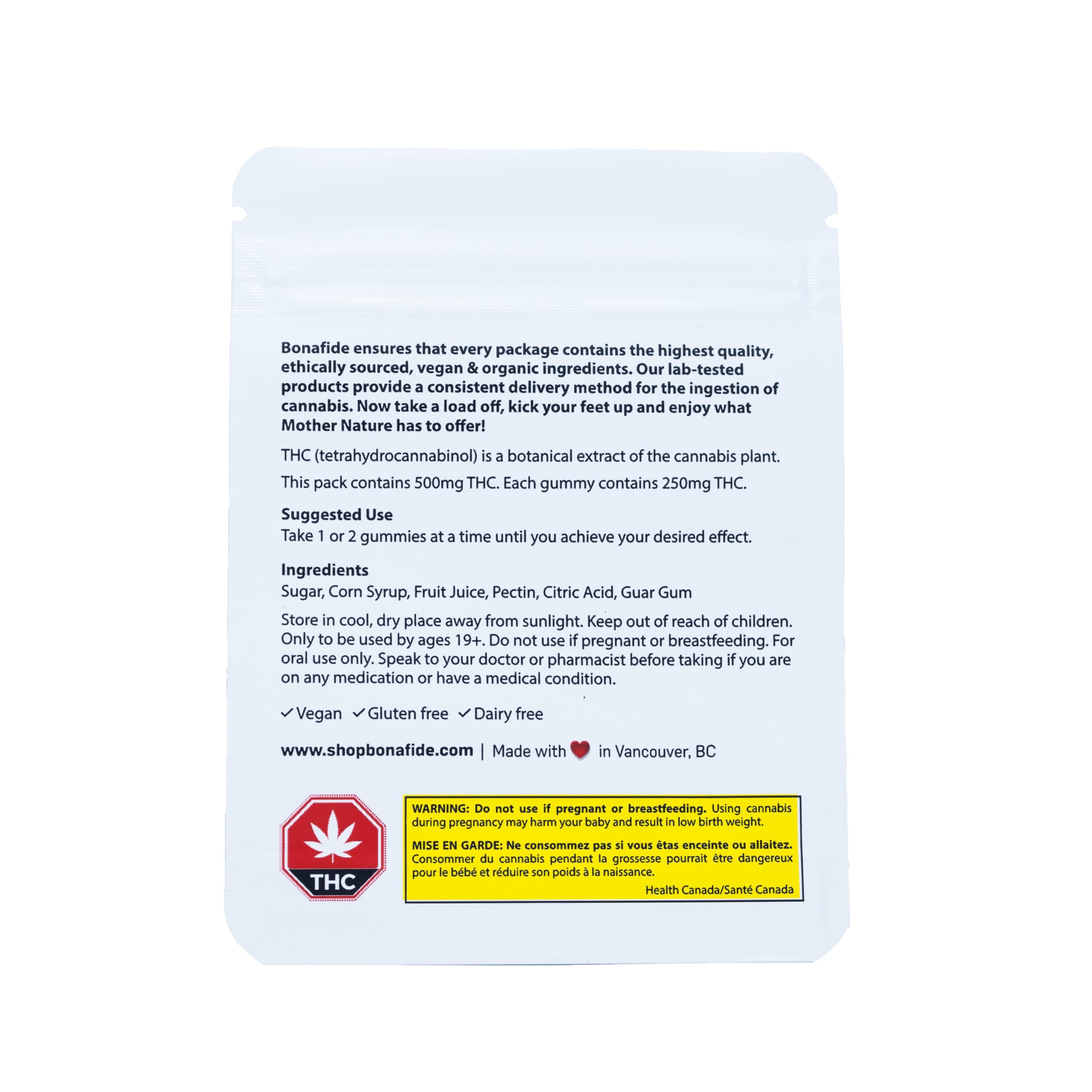 • Amount THC per serving: 250mg THC (500mg THC per package)